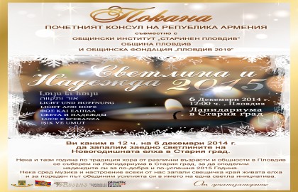 За 5-та поредна година, Ехиязар Узунян - почетен консул на Република Армения в гр. Пловдив, ОИ "Старинен Пловдив" и ОФ "Пловдив 2019", канят гражданите около борчето на Лапидариума в Стария град на 06.12.2014г. от 12 часа .