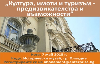 Тематичен форум „Култура, имоти и туризъм - предизвикателства и възможности” ще се проведе на 7 май 2015 г. (четвъртък) от 13:00 часа в Регионален исторически музей – Пловдив, зала Съединение.