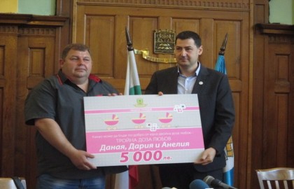 Родителите на тризнаци Недялка и Костадин Тоборови получиха днес еднократна помощ от 5000 лева и социален асистент за 2 години. Лично кметът на града Иван Тотев връчи днес чек на щастливия баща на трите малки госпожици- Даяни, Дария и Анелия