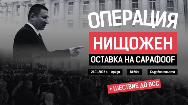 Протест пред Съдебната палата и шествие до сградата на ВСС организират в сряда - 21 януари в 18.30 часа, от "Правосъдие за всеки" с искане изпълняващият длъжността главен прокурор Борислав Сарафов да подаде оставка или да бъде отстранен.