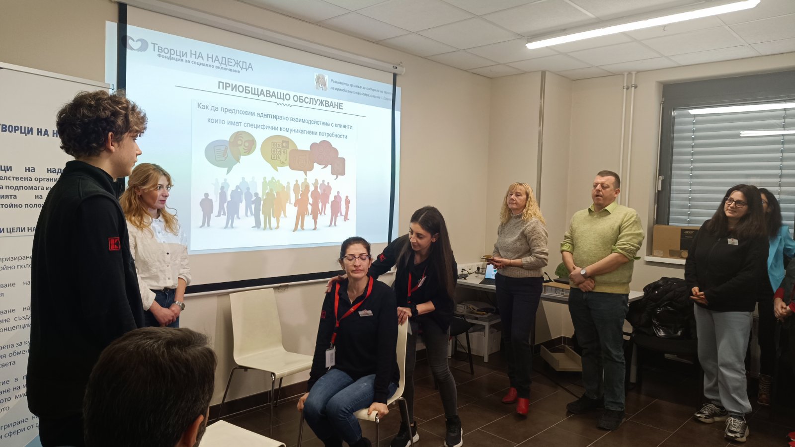 След това екипът се включи в ролева игра, за да упражни поведение, реакции и умения. „Разиграхме ситуация от реалния живот. Представихме си, че майка с дете в количка със специални потребности пазарува. На касата се образува опашка, хората започват да се изнервят, а детето се притеснява и иска да излезе. Целта беше да упражним как касиерът трябва да реагира спокойно, с разбиране и емпатия – да даде приоритет на майката, да намали напрежението в опашката и да помогне детето да се почувства по-спокойно“, обясниха психолозите от центъра.