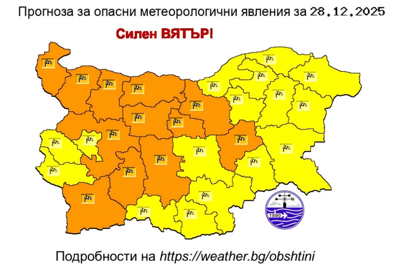 За 28 декември 2025 г. НИМХ издава предупреждение от втора степен (оранжев код) за силен и бурен северозападен вятър в 12 области от страната с пориви между 25 и 30 m/s, а в останалата част от страната е в сила предупреждение от първа степен (жълт код) с пориви до 24 m/s.